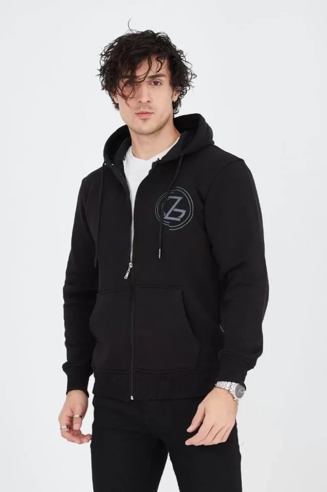 Erkek Kapüşonlu Baskılı Fermuarlı Hırka - Siyah