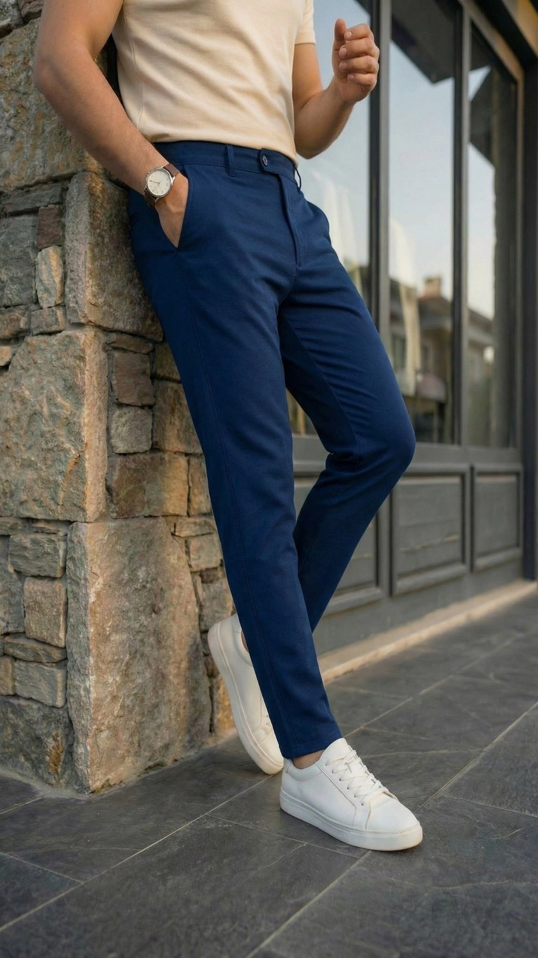 Erkek Belden Düğmeli Cepli Dokuma Pantolon